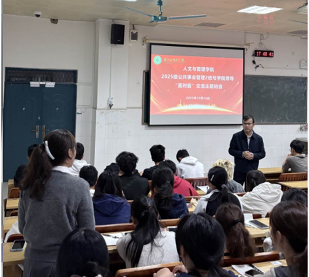 为深入贯彻“以学生为中心”的教育理念,切实关心学生成长发展,进一步搭建学生与学院领导之间的交流对话平台,我院以进班级的形式开展2025-2026学年秋季学期“学生与学院领导面对面”交流活动。我院党委书记、院长李常应,党委副书记、纪委书记陶肖云,学生科副科长韦艳春,新生各班班主任及2025级全体新生参加了交流活动。