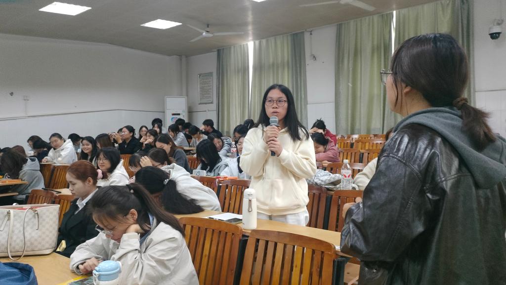 在互动问答环节,曹老师抛出问题:“大家梦寐以求的工作是什么样的?”同学们踊跃回答,2023级健管1班黄春芳说:“我认为这份工作首先应该为员工支付‘五险一金’,还要有节假日和双休福利,工作环境也要优越,最重要的是这份职业是自己喜欢的。”曹老师坦言,当前就业形势严峻,理想标准与市场需求存在很大的差距,她建议同学们树立“先就业再择业”的理念,在实践中提升能力。