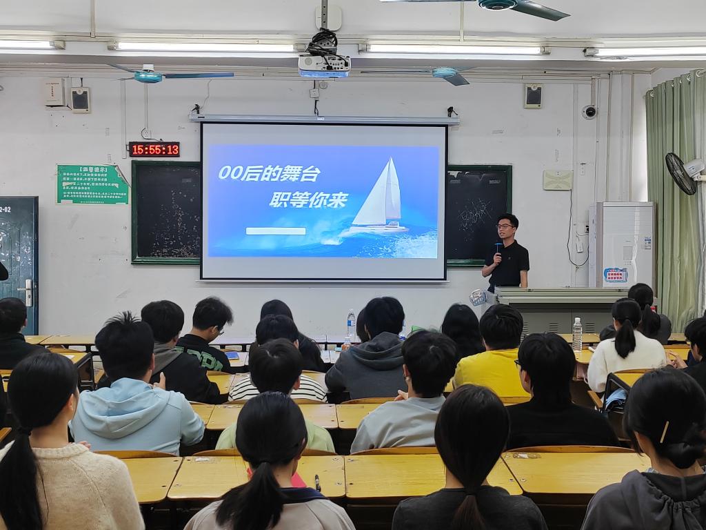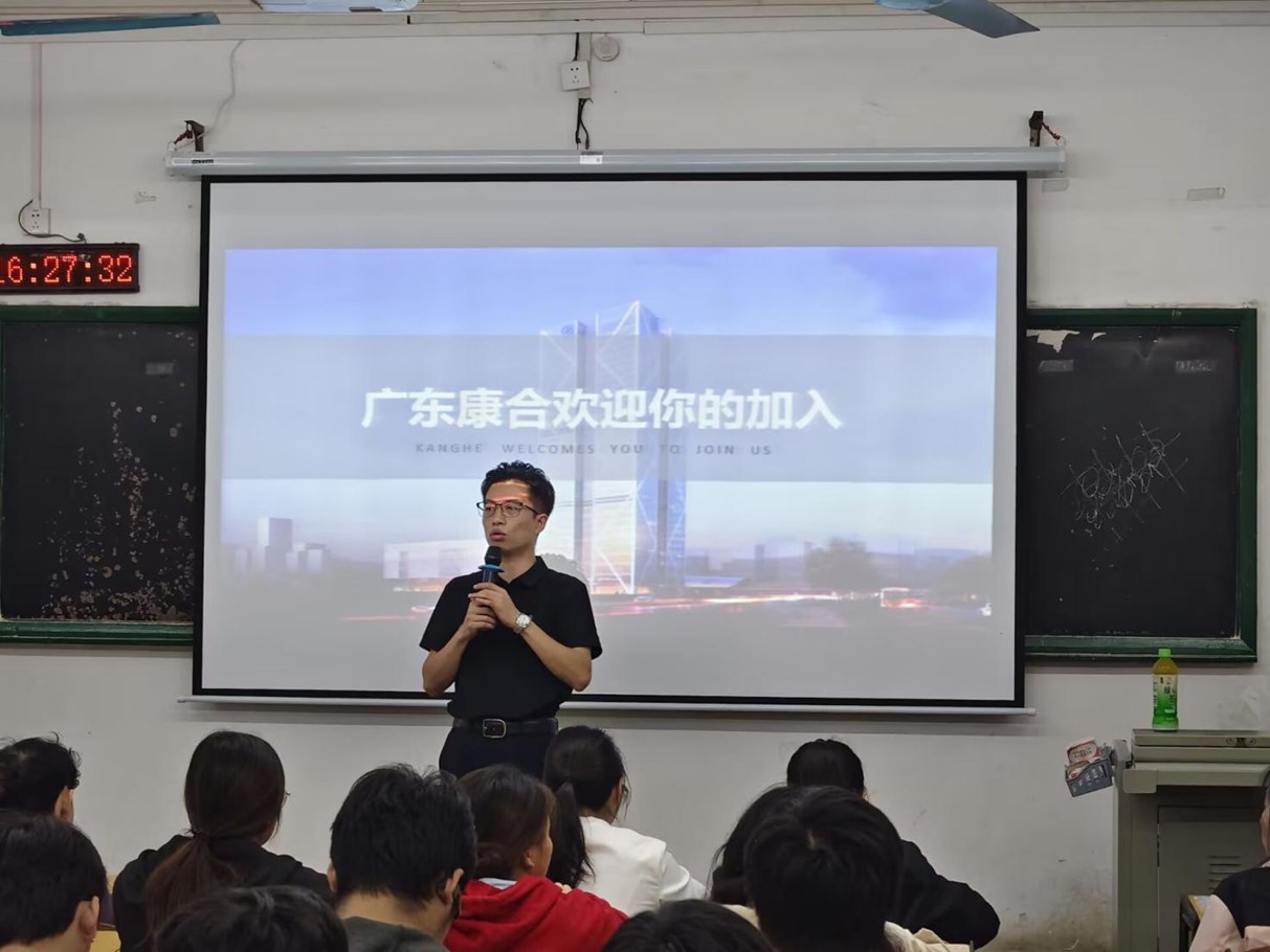 11月5日下午4:00,广东佛山盛世康合健康产业集团专场招聘活动在百城校区4栋202室开展。本次招聘活动由该集团旗下康合营养家广东分公司佛山地区负责人曾鑫源主讲,2026届毕业生和2023级市场营销班全体同学到场参加。