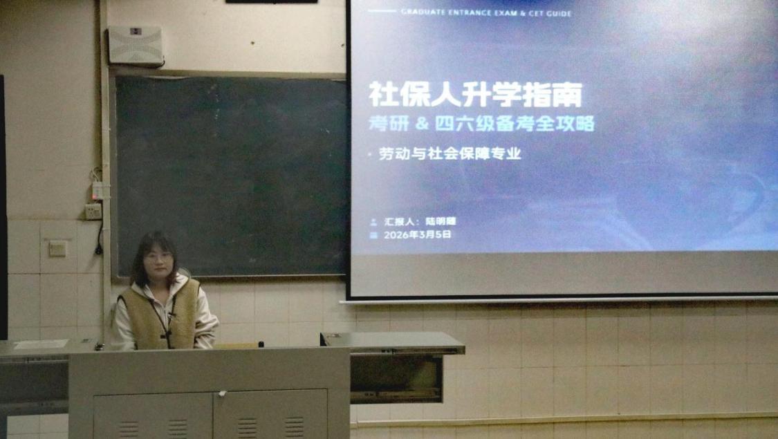 3月5日19:00,我院在6栋402教室召开社保专业考研指导分享会,特邀我院2021级社保班本科毕业生、暨南大学劳动与社会保障专业研究生陆明随指导,她围绕考研和英语四六级备考两大主题进行了分享。