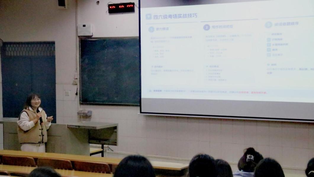 随后,她着重强调了英语四六级成绩在考研过程中的重要性,并以此为切入点,系统介绍了英语四六级考试的科学备考方法。她从时间分配策略、听力预读技巧、写作时间把控以及阅读做题顺序优化等多个维度,为同学们提供了具体可行的应试建议,助力同学们稳步提升答题能力,为未来考研打下坚实基础。