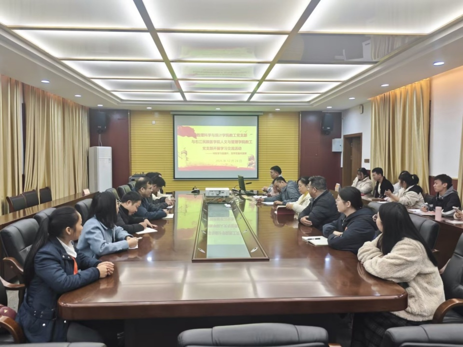 随后,我院教师党支部书记江建明和数理科学与统计学院教师党支部书记姜德烁分别介绍了本支部的基本情况,并就党建与业务融合、党员发展、理论学习、主题党日活动、乡村振兴赋能等方面进行了深入的沟通和交流。之后,双方教师党员围绕“党建品牌创建”“党建引领事业发展”“党建育人融合”“党建科研双促” 等议题进行自由交流。大家结合自身工作实际,畅谈心得体会,分享成功案例,并就如何发挥党建对教学、科研、学科建设等中心工作的引领和推动作用、如何打造具有影响力的党建品牌、如何更好发挥党员在立德树人和科研攻关中的先锋模范作用等问题交换了意见。现场思想碰撞,灵感迭出,氛围融洽而热烈。